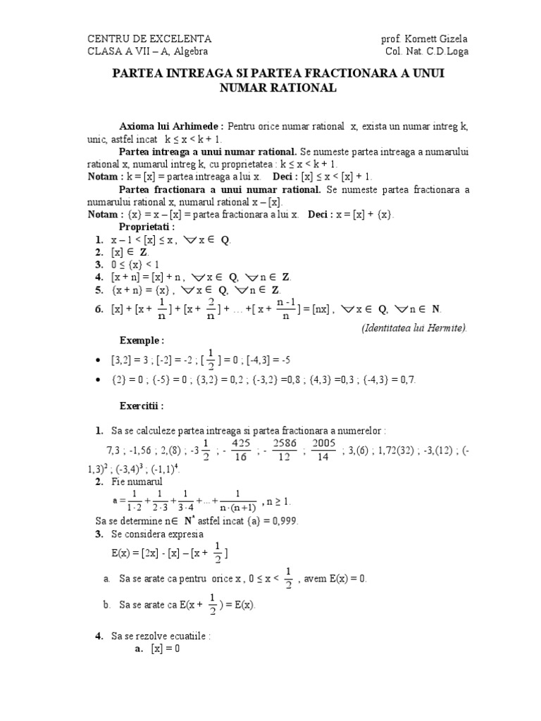 Parte Intreaga Parte Fractionara Clasa A Vii A