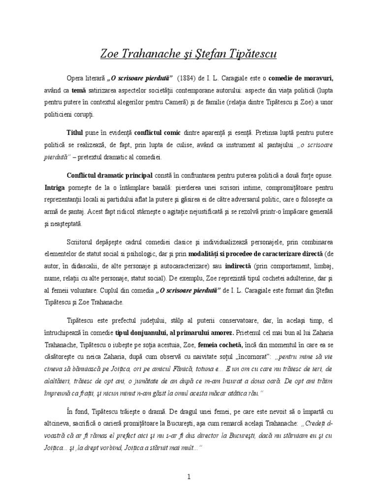 Doc Relatia Dintre Doua Personaje Stefan Tipatescu Si Zoe Trahanache O Scrisoare Pierduta I L Caragiale Elena Grigorescu Academia Edu