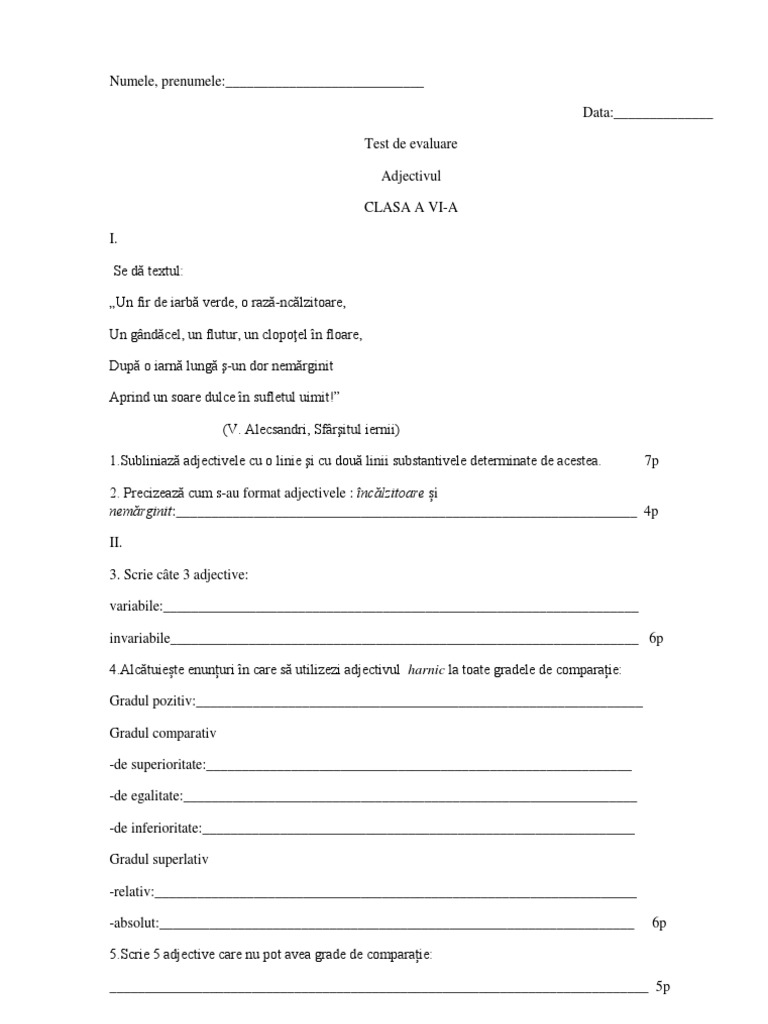 2017 clasa 7 fise de lucru cu itemi si teste de evalaure author. și apucându l de mâna cealaltă îl smucește de la mamița lui tocmai când trenul clănțănind din roate trece la un macaz. învăţământ gimnazial limba şi literatura român ă. A vii a adjectivul test de evaluare cls.