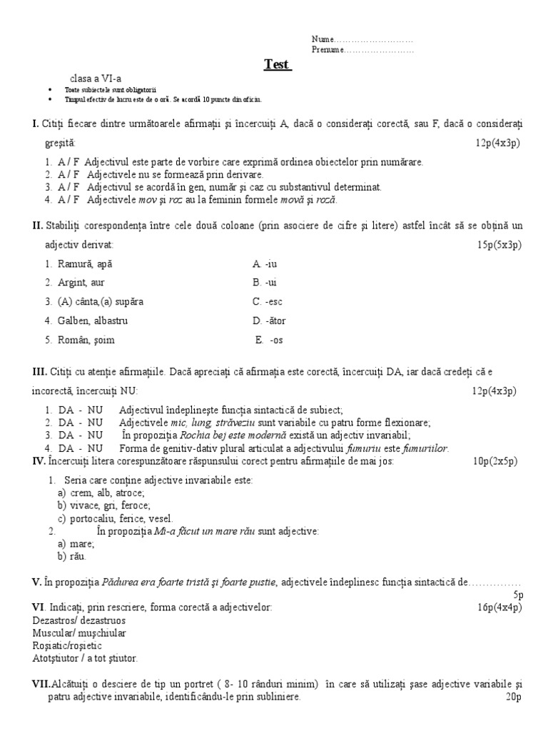 Test adjectivul clasa 7. Este un test care cuprinde toate categoriile gramaticale ale adjectivului. Test adjectivul clasa a 7 a. 0 stele 0 review uri. Teste matematică clasa 7.
