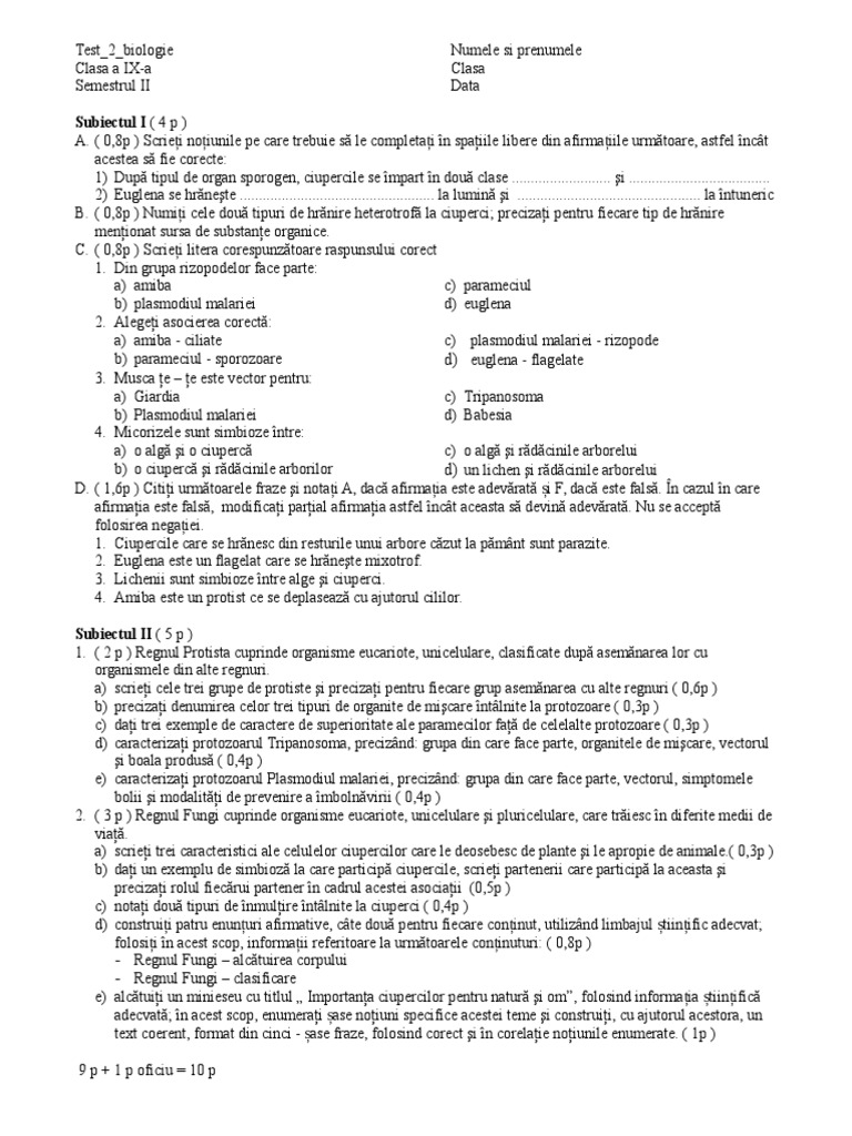 Test Biologie Clasa Ix Regnul Protista Si Fungi