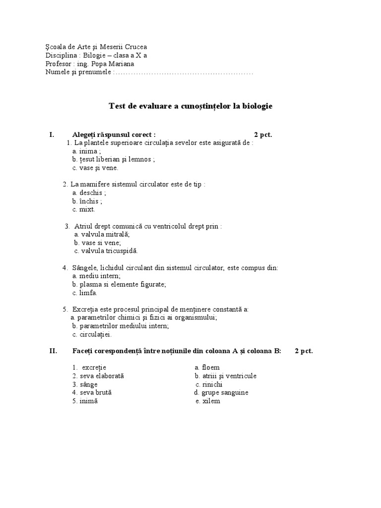 Test Biologie Clasa Ix
