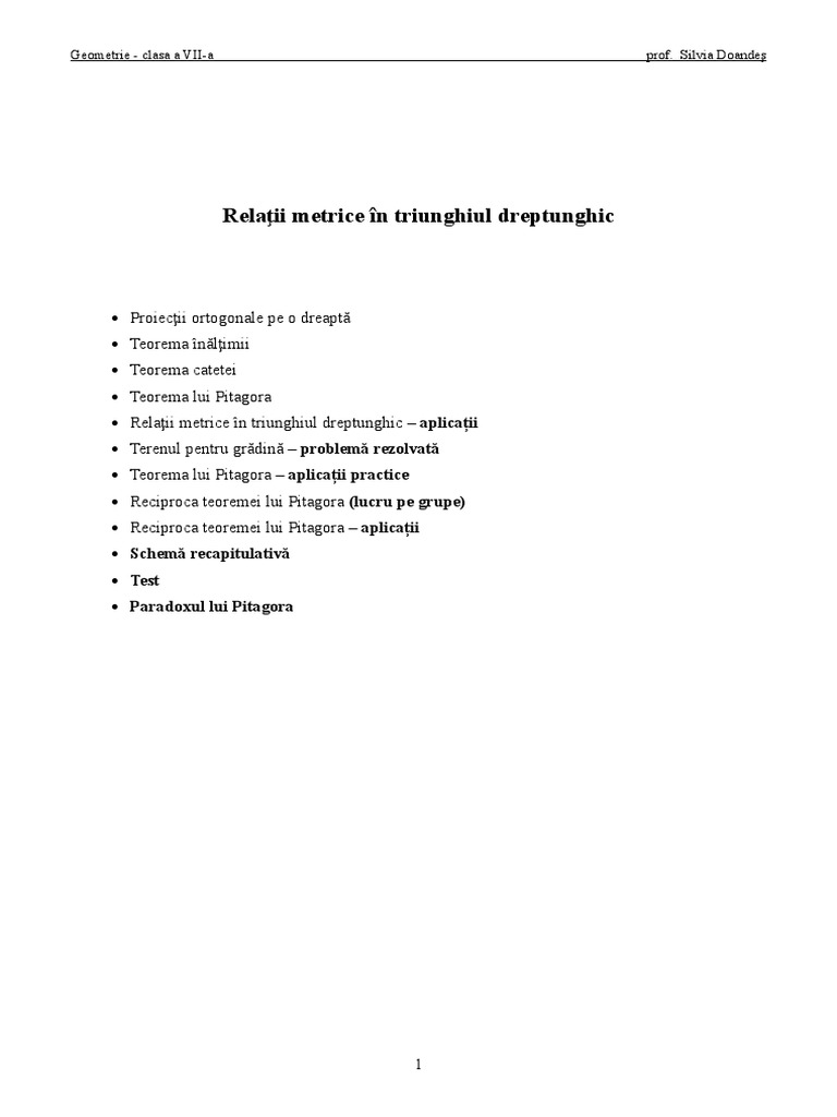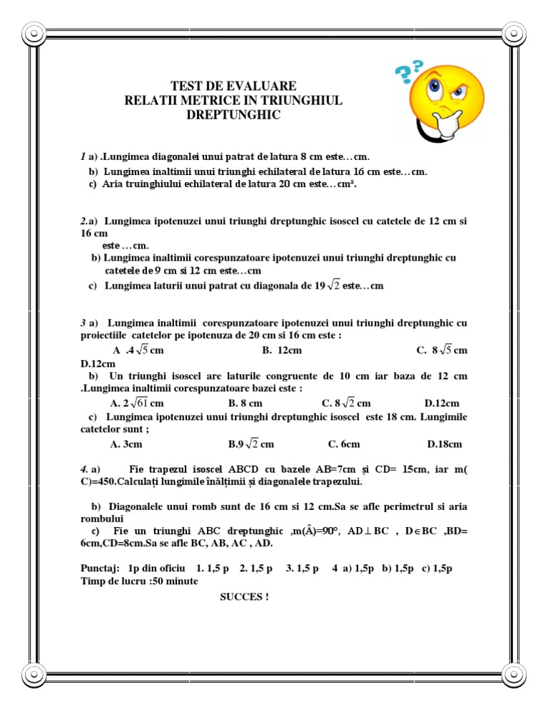 Test Relatii Metrice In Triunghiul Dreptunghic Clasa A 7 A Fertu Carmen 31 03 2008